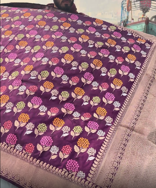 Pure Katan purple garden bloom saree- BOUQUET OF FLOWERS